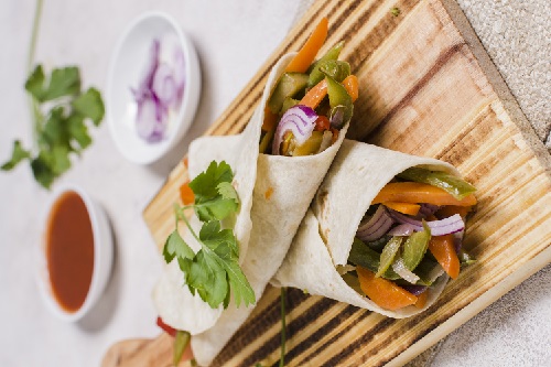 1 whole-wheat tortilla or wrap 1 grilled chicken breast (sliced) ¼ cup shredded lettuce or spinach ¼ cup bell pepper slices (red, yellow, or green) 2–3 cucumber slices or pickles 1 tbsp plain Greek yogurt or light mayo 1 tsp mustard or hummus (optional) Salt, pepper, chili flakes